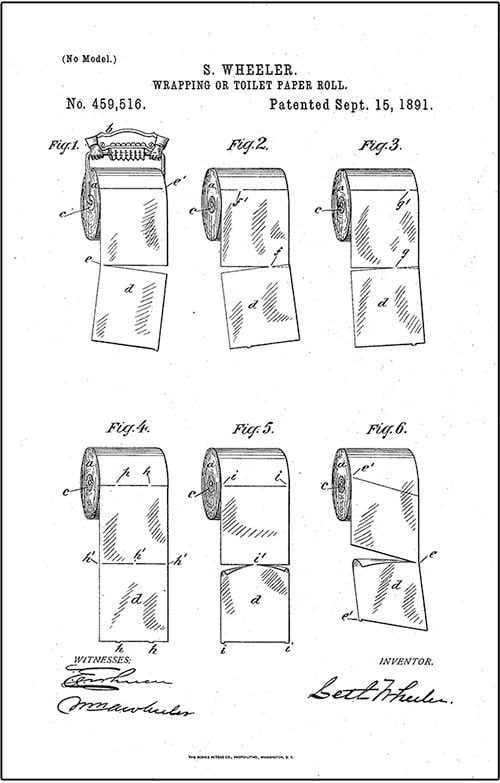 Wheeler patentoval prvé perforované obrúsky v roku 1871 a spustil svoju Albany Perforated Wrapping Paper Company v roku ’77, dva roky predtým, ako bratia Scott debutovali so svojou značkou. Wheeler podal desiatky patentov až do 20. rokov 20. storočia, vrátane patentov na toaletný papier zvlnený do ozdobných vzorov a jednorazových „vložiek na prsia“, ktoré mali nahradiť drahé korzety. Ale jeho najväčším vynálezom bol dizajn držiaka toaletného papieru v roku 1891. Všadeprítomný prípravok, ktorého patentová ilustrácia vyriešila problém zavesenia „nad/pod“ ešte predtým, ako vôbec začal. Pozrite sa: