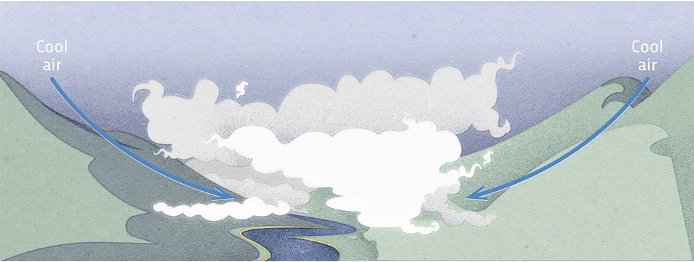 Hmla v údolí sa zvyčajne tvorí v najnižších častiach údolia, keď sa studený, hustý vzduch usadzuje a kondenzuje a vytvára tak hmlu. Je ohraničená miestnou topografiou, ako sú kopce alebo hory a môže pretrvávať aj niekoľko dní.