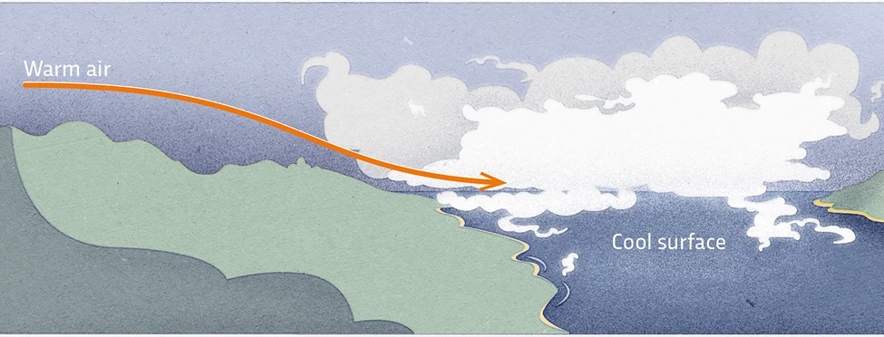 Morská hmla je typ advekčnej hmly, ktorá sa môže vyskytnúť, keď teplý, vlhký vzduch prichádza z pevniny do chladnejšieho mora, alebo keď teplý front narazí na studený oceánsky vzduch. V Spojenom kráľovstve je severovýchodné pobrežie veľmi náchylné na morskú hmlu kvôli studeným vodám Severného mora.