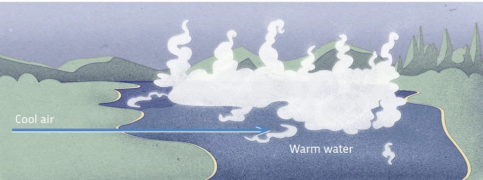 Odparovacia hmla je podobná advekčnej hmle a vytvára sa, keď studený vzduch prechádza cez vlhkú zem alebo teplú vodu. Keď sa teplejšia voda vyparí do nízkych pásov vzduchu, ohreje vzduch a spôsobí jeho stúpanie. Keď tento teplý, vlhký vzduch stúpa nahor, mieša sa s chladnejším vzduchom, až kým jeho vlhkosť nedosiahne 100 percent a vytvorí sa hmla. Nad jazerami, rybníkmi a dokonca aj vonkajšími bazénmi často uvidíš túto “odparovaciu” hmlu.