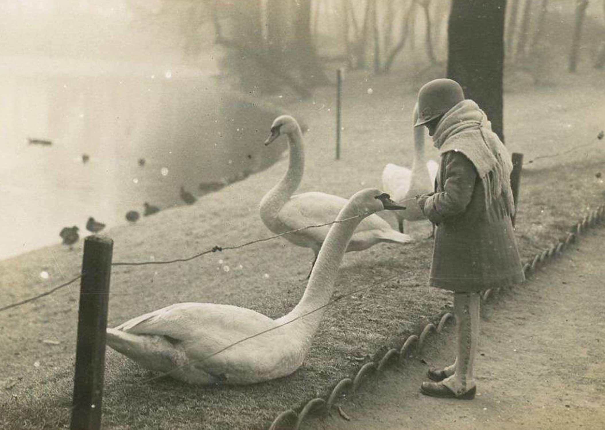 “Dievča kŕmi labuť. Bois de Boulogne, Paríž, asi 1930.”