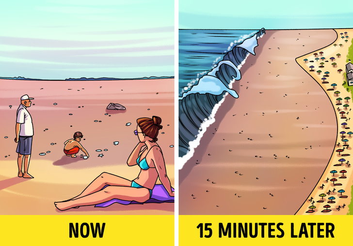 Keď je voda abnormálne ďaleko od brehu, je to znak cunami. Ak si to všimneš, mal by si všetkých varovať. Bohužiaľ, v roku 2004 ľudia nevenovali pozornosť tomuto znaku v Indickom oceáne. Takmer na celom brehu bolo pobrežie úplne odhalené a ľudia išli na zber rýb a mušlí. Na dvoch plážach však boli ľudia, ktorí o tejto skutočnosti vedeli: 10-ročná anglická dievčina menom Tilly Smith a učiteľka biológie John Chroston. V ten deň sa im podarilo zachrániť životy mnohých ľudí.