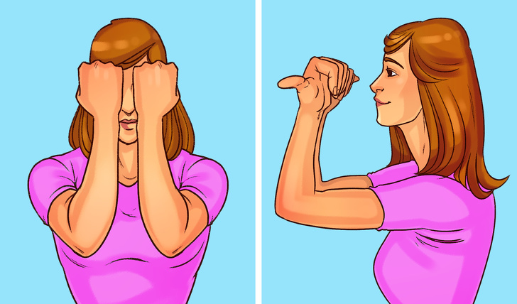 Zdvihni ruky tak, aby tvoje predlaktia boli zarovno s tvojou tvárou. Pokús sa chytiť prstami spodnú časť dlane. Ak to dokážeš vydržať 1-2 minúty, je to v poriadku. Ak však pociťuješ brnenie, necitlivosť či bolesť, môže ísť o syndróm karpálneho tunela.