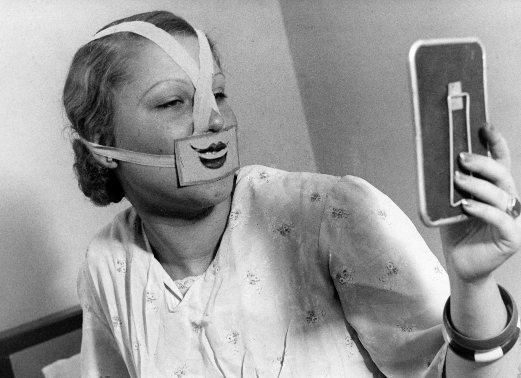 Žena s maskou vyrobenou na boj proti melanchólii v „škole úsmevu“ v Budapešti. 1937