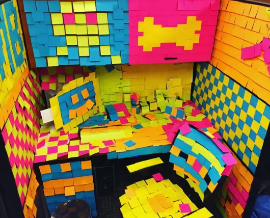 Je to ako neónová 8-bitová nočná mora! Dúfajme, že umelci zodpovední za toto lepiace umenie neboli potrestaní