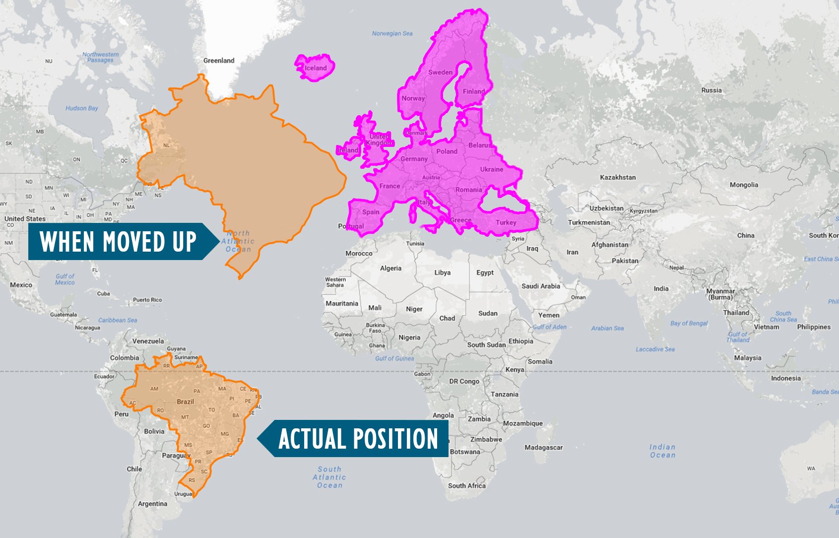 Európsky kontinent, ktorý v skutočnosti dominuje veľkej časti severnej pologule, v porovnaní s Brazíliou (8 515 767 km2), vyzerá takmer rovnako. Ak však vezmeme Brazíliu a umiestnime ju vedľa Európy, môžeme vidieť zmenu veľkosti.