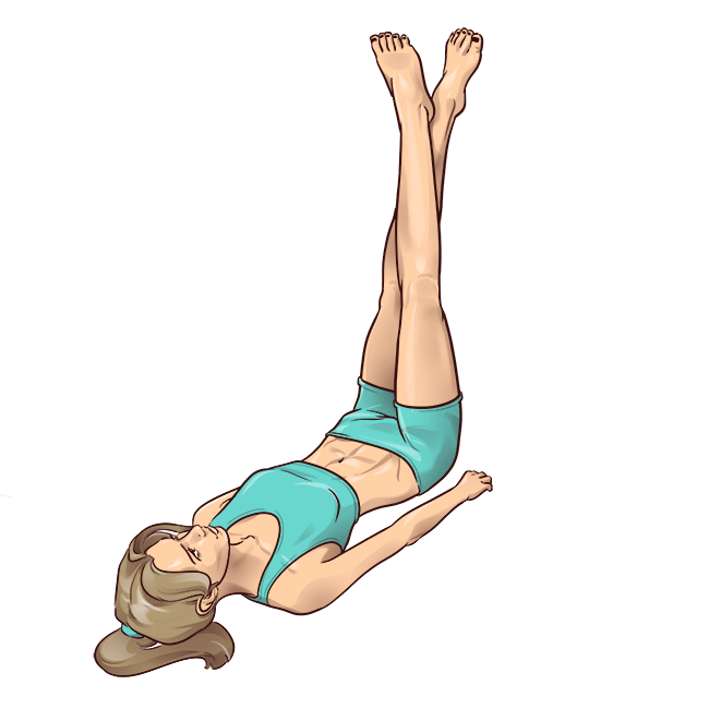 Druhá časť: Východisková poloha – v ľahu na chrbte, nohy zdvihnuté a trochu pokrčené v kolenách. Robte švihy oboma nohami, pričom zdvihnite zadok a hornú časť nôh držte napnutú.