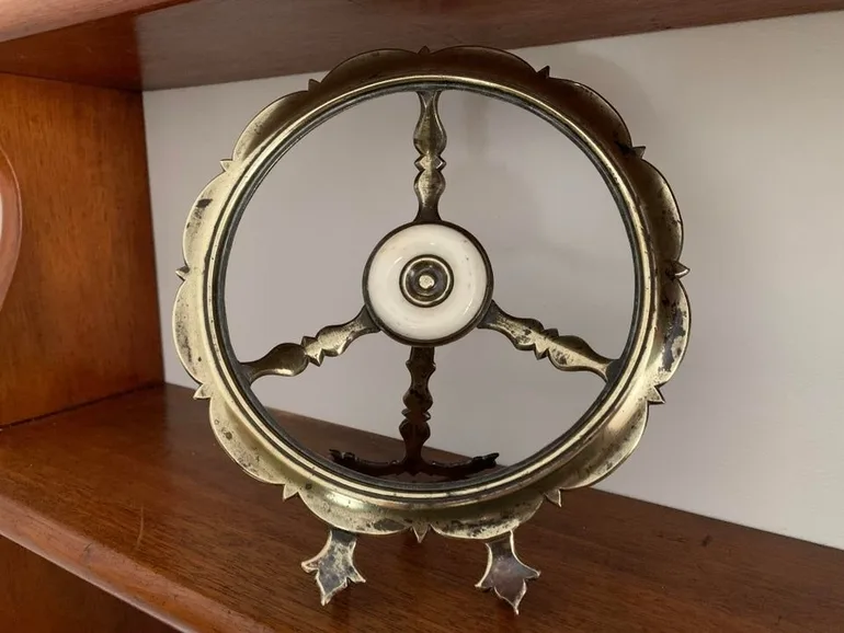 „Starožitný mosadzný stojaci predmet s centrálnym ciferníkom. Myslím, že ciferník je porcelánový. Mohol by byť juhoázijského alebo blízkovýchodného pôvodu?“