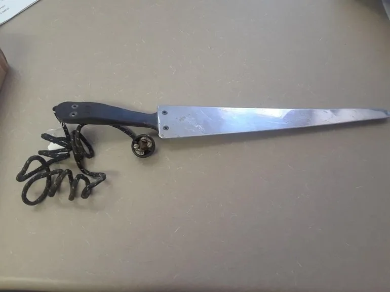 „Ľahký kovový kus, plochý a zúžený s rukoväťou z tvrdej kože a elektrickým káblom potiahnutým látkou. Meria približne 18 palcov vrátane rukoväte.“