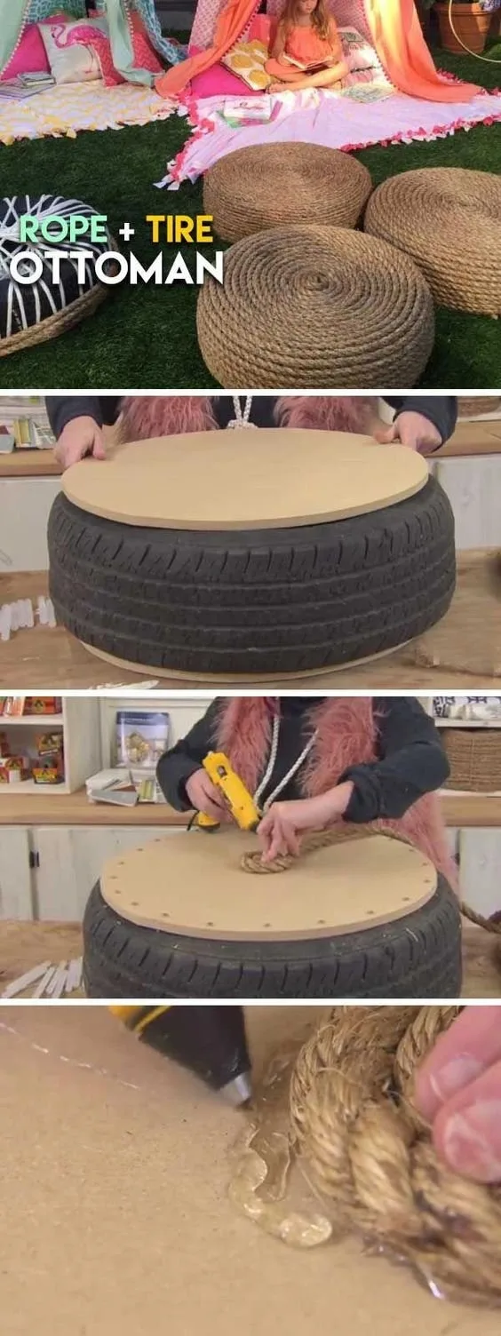 Vytvorenie útulnej atmosféry na vašom dvore nemusí byť príliš zložité. Tento nápad s otomanom z pneumatík a lana je taký kreatívny a vyzerá pomerne ľahko realizovateľný.