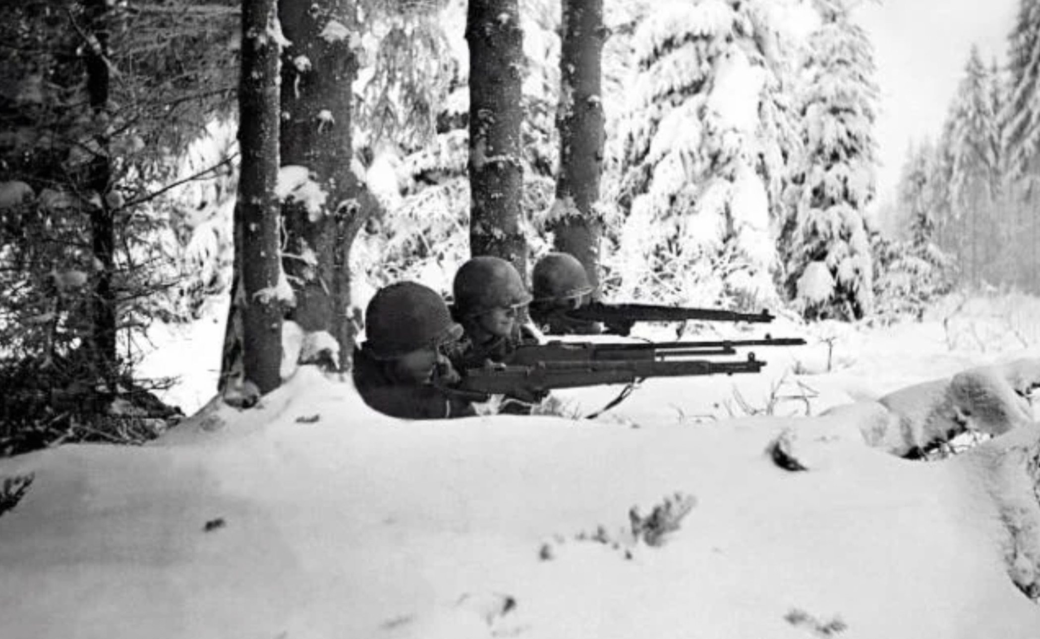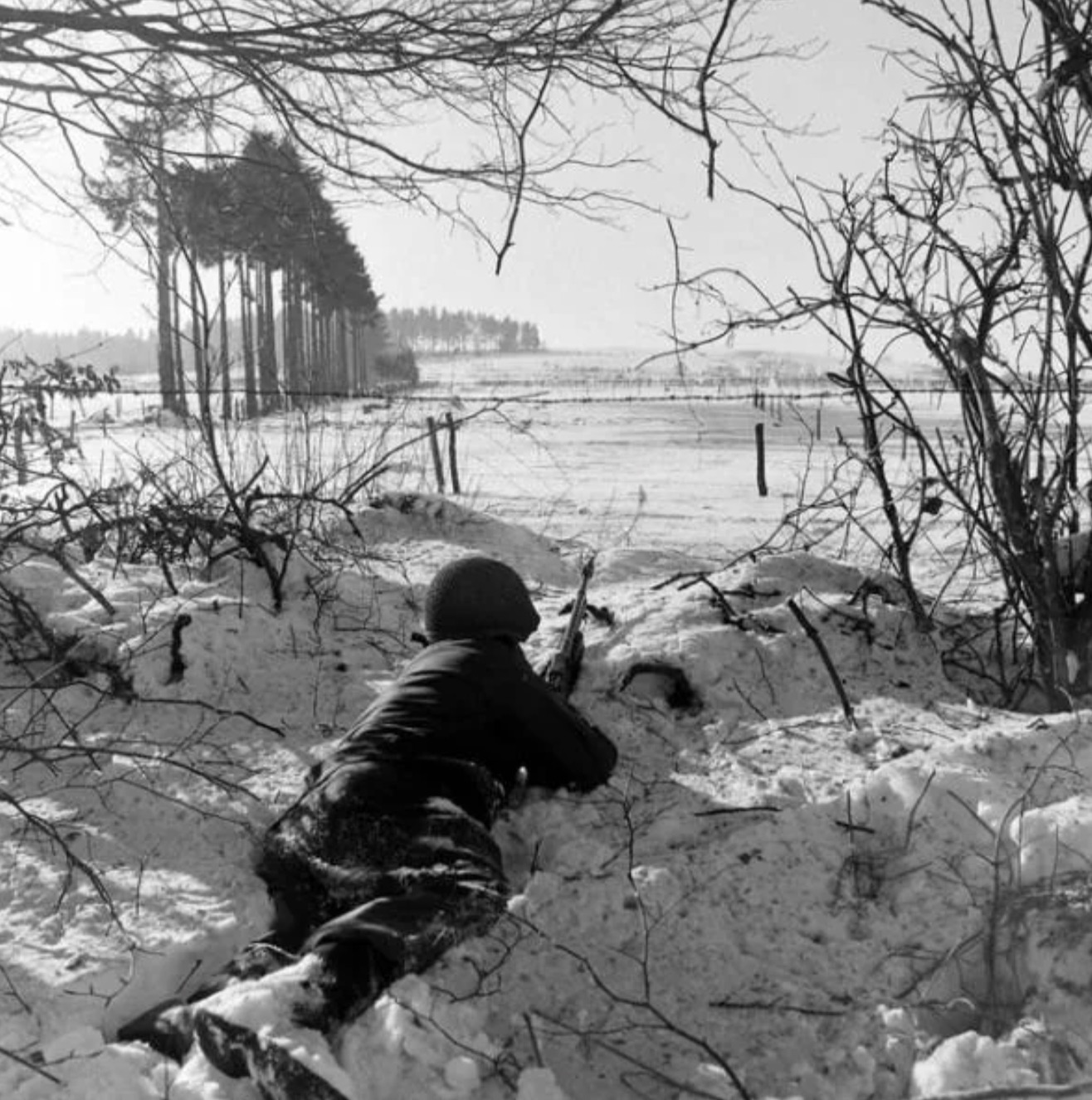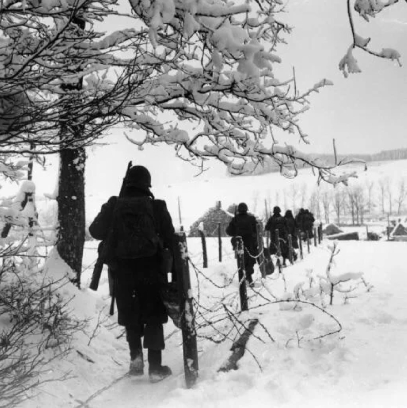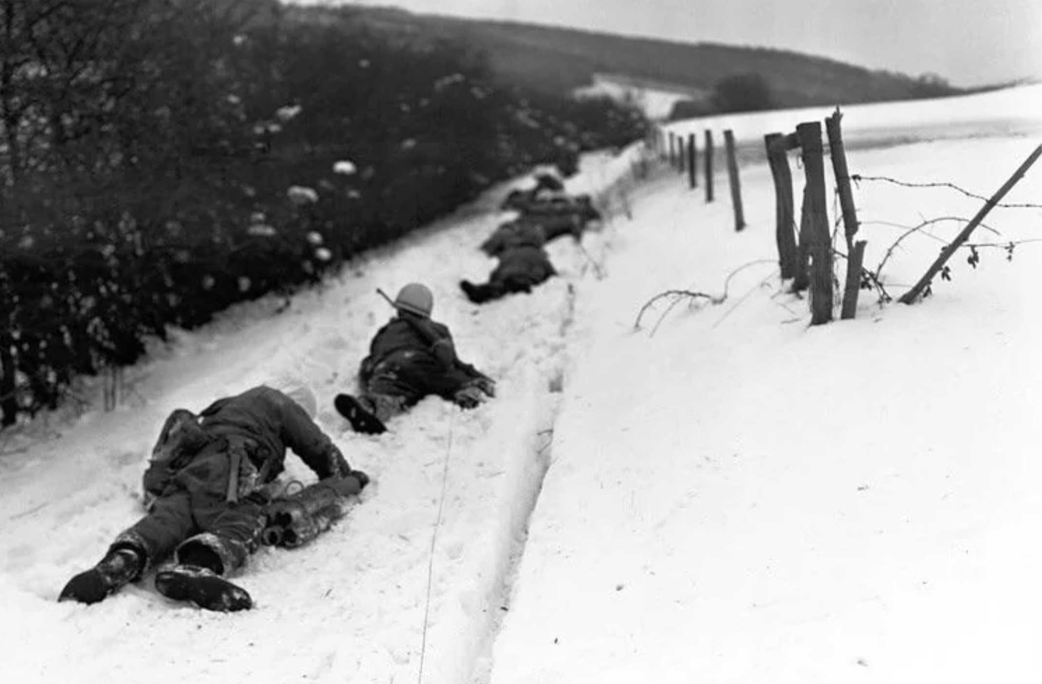 Vojaci sa plazia popri plote, bitka v Ardenách, 16. december 1944 – 28. január 1945