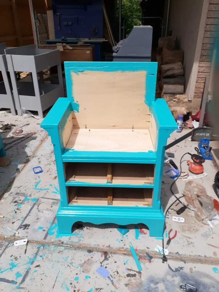 Využila aj obloženie starej komody, ktoré prilepila na vonkajšiu stranu opierky na ruky, čím dodala konštrukcii „honosnejší“ vzhľad. Potom po obrúsení povrchu celú vec (okrem dna zásuviek) natrela živou farbou a nechala stoličku vyschnúť.