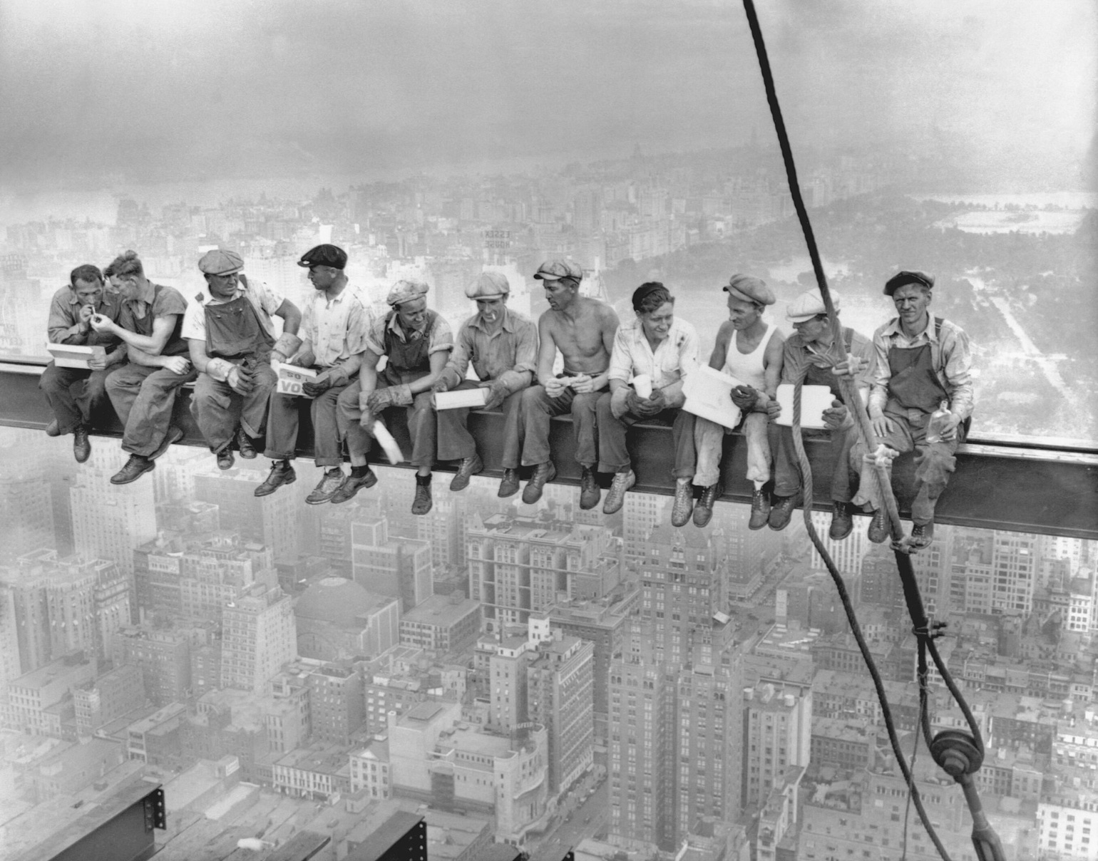 Najznámejšia obedňajšia prestávka. Fotograf je neznámy a v skutočnosti išlo o zinscenovaný reklamný trik pre budovu RCA v decembri 1933.