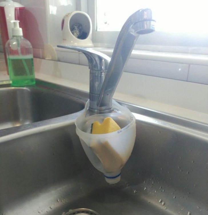 Za pomoci nožníc si môžeš vytvoriť šikovný držiak na špongiu. A navyše využiješ nepotrebnú plastovú fľašu!