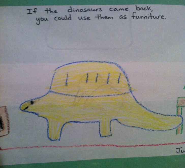 „Moja sestra našla starú kresbu, ktorú nakreslila… Má správnu myšlienku: Keby sa dinosaury vrátili, mohli by ste ich použiť ako nábytok.“