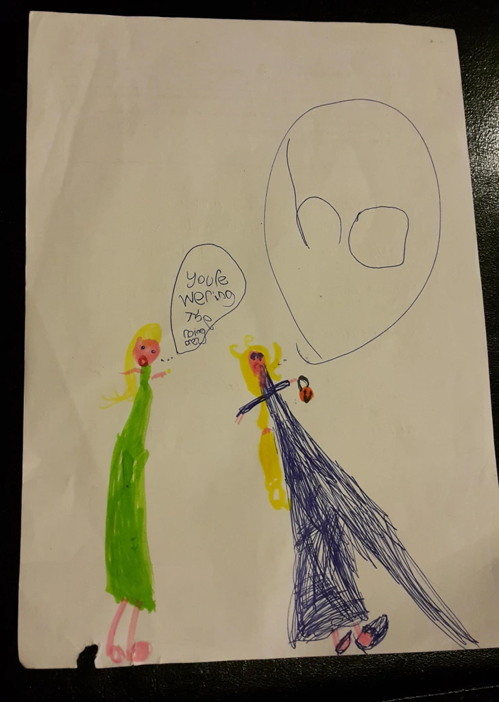 „Koledujúca Elsa si neberie servítku pred ústa, a jednoducho sa vysmieva. (Moje dieťa to nakreslilo).“