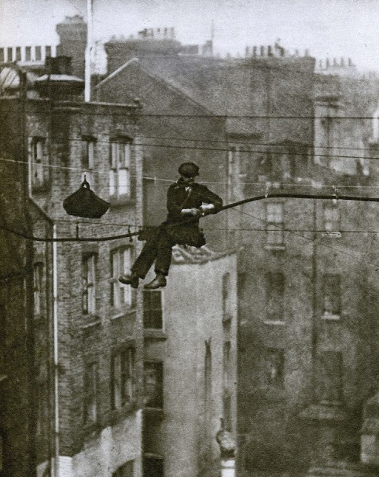 Inžinier pripevňuje telefónny kábel k novému nosnému drôtu Londýn, 20. roky 20. storočia