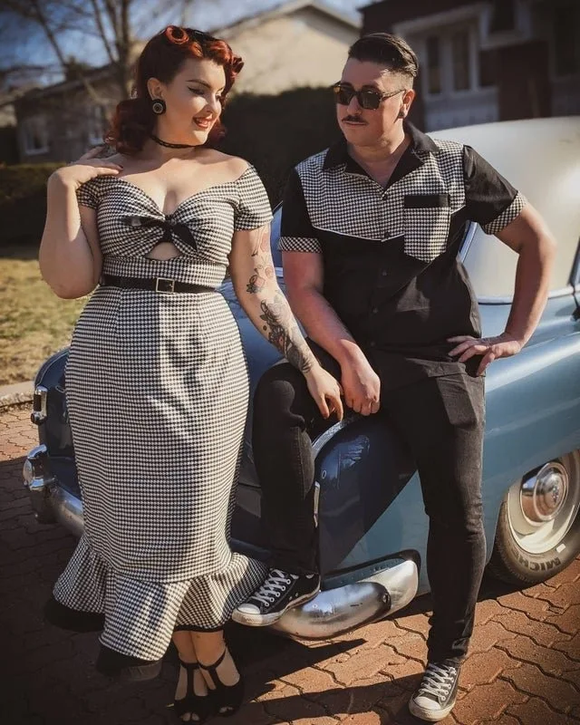 Ak by ste si mohli so svojím partnerom obliecť rovnaké oblečenie, aký štýl by ste si vybrali? Tento pár sa tu vyníma v oblečení inšpirovanom 50. rokmi. Páči sa mi, ako mužova košeľa ladí s dámskymi šatami. Nevyzerajú tak štýlovo?