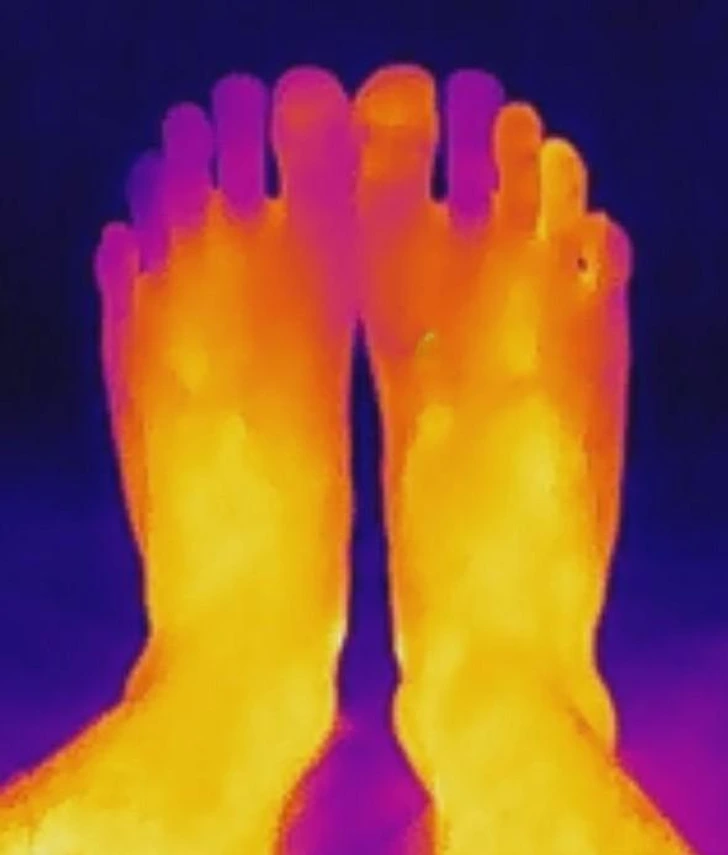 „Infračervená kamera ukazuje rozdiely v prietoku krvi do každého prsta na nohe.“