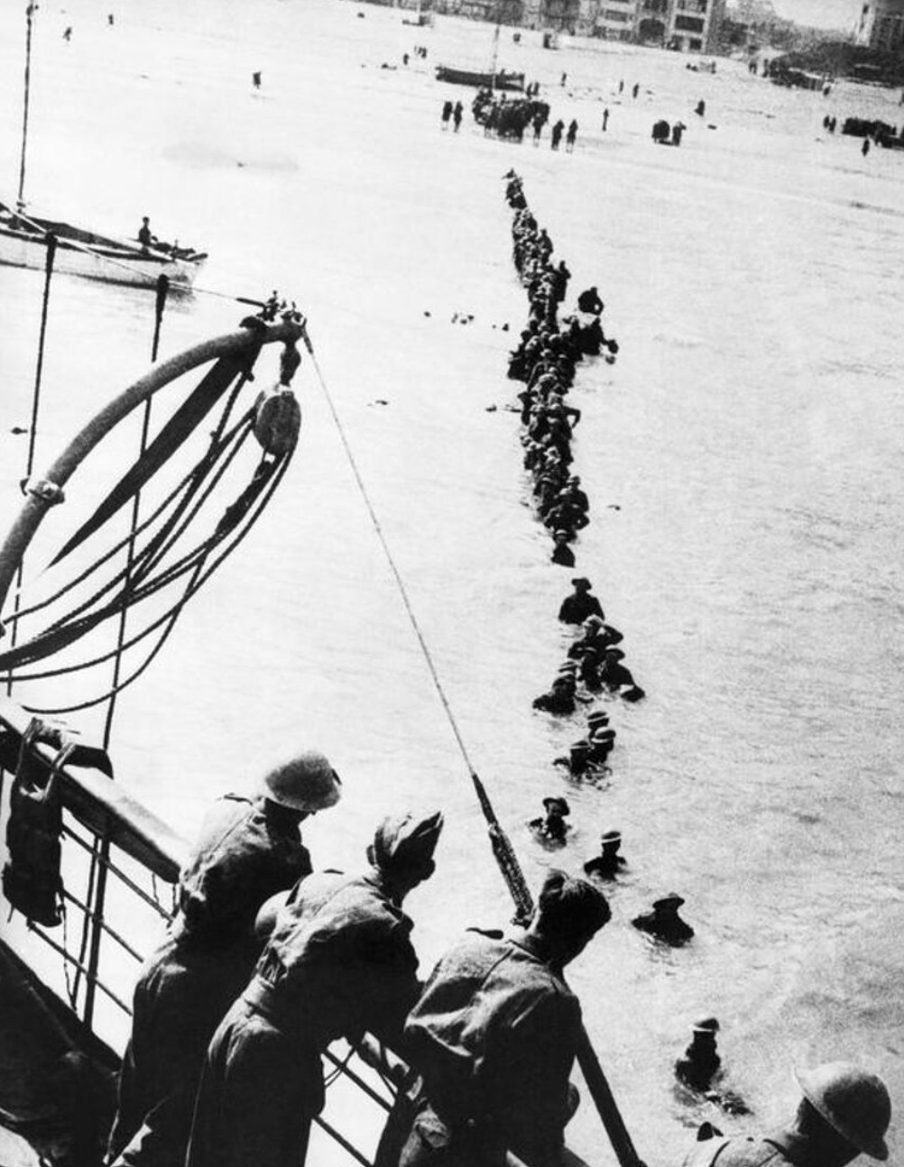 Britskí vojaci sa brodia k čakajúcemu torpédoborcu pri Dunkerque počas operácie Dynamo. Máj 1940