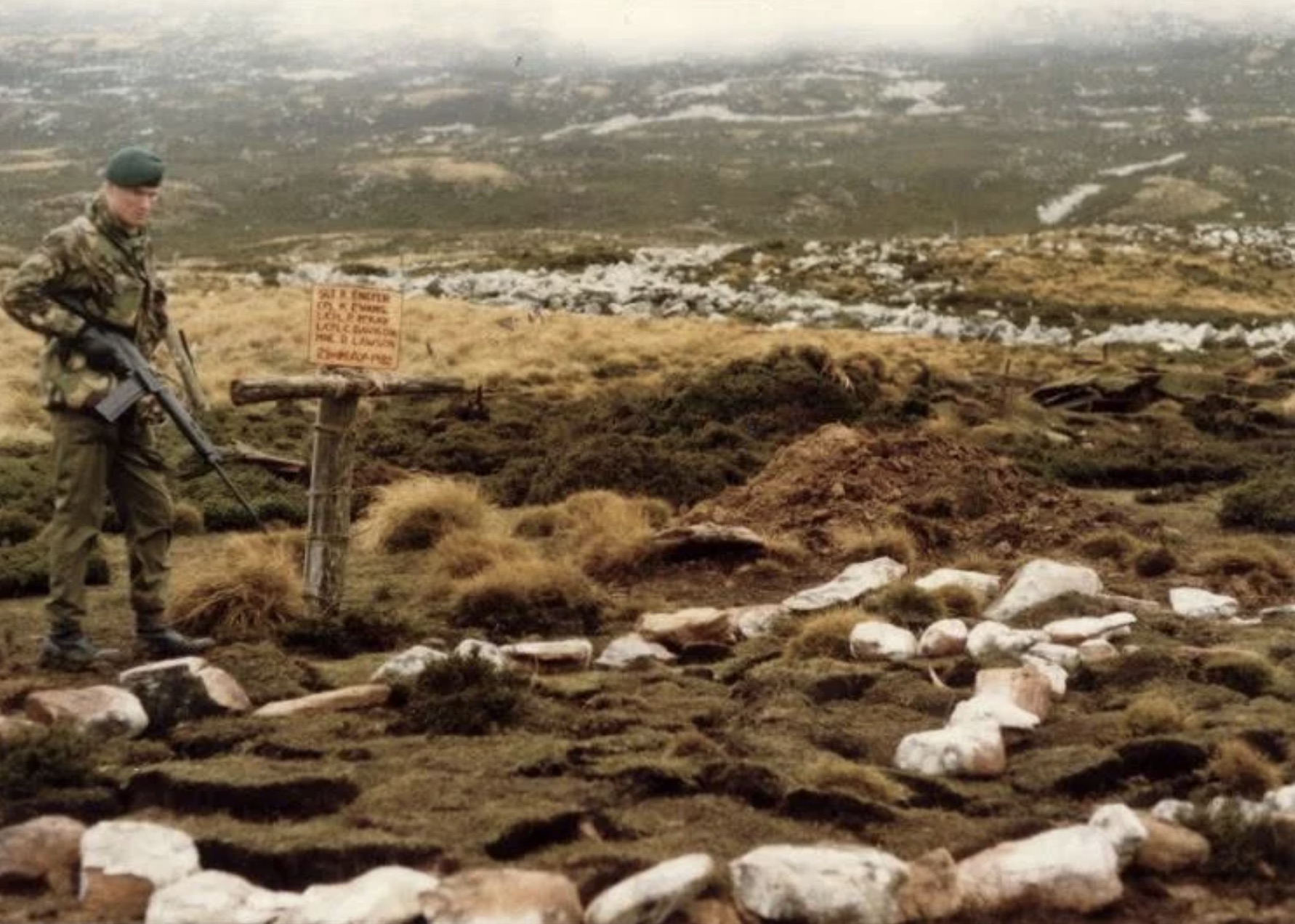 Mariňák Lazz Hewings navštevuje hrob v zátoke Ajax. Falklandy, 1982