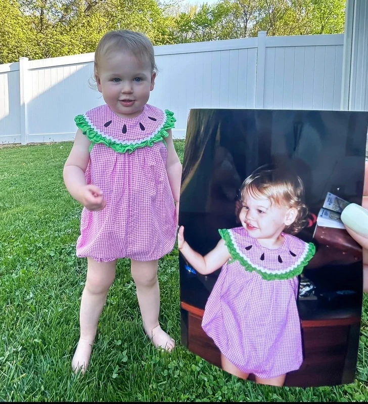 „Moja fotografia v roku 1997 a moja dcéra v rovnakom oblečení v roku 2024“