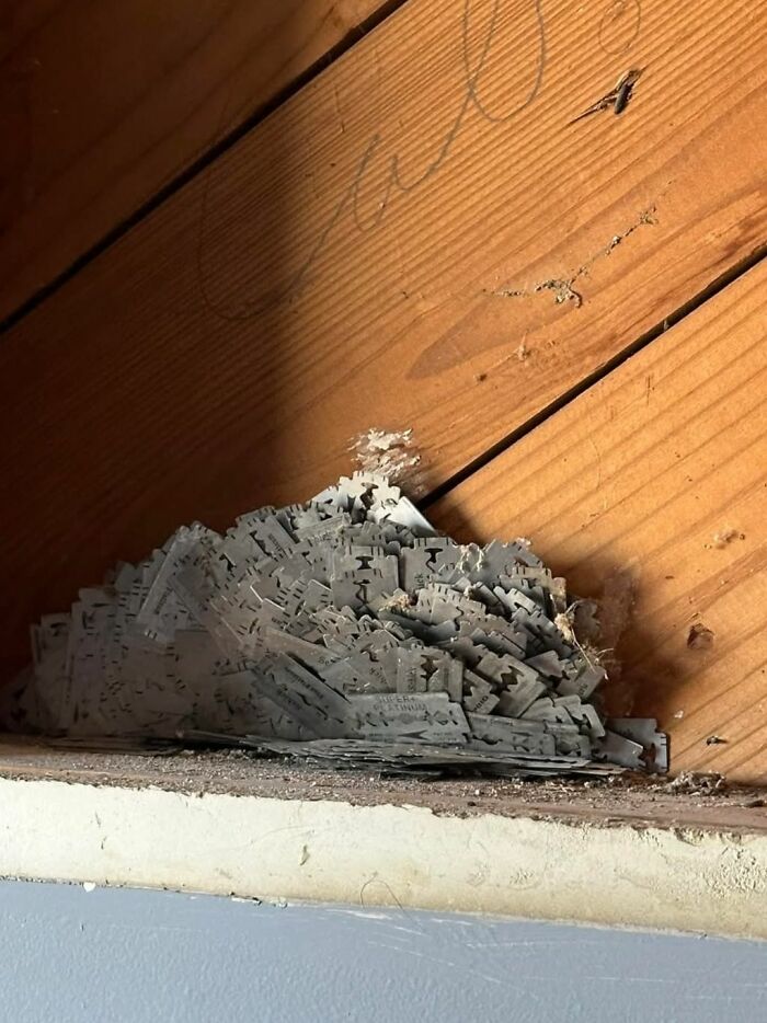 Tieto žiletky s dvojitým ostrím sa našli v stene kúpeľne. Kedysi dávno mali skrinky na lieky vzadu štrbinu. Bola tam umiestnená zámerne, aby sa tam dali vyhodiť staré žiletky, ktoré jednoducho zapadli do steny.