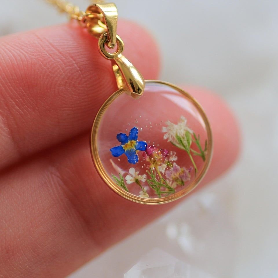 „Malý prívesok, ktorý som vyrobila pomocou skutočných kvetov.“
