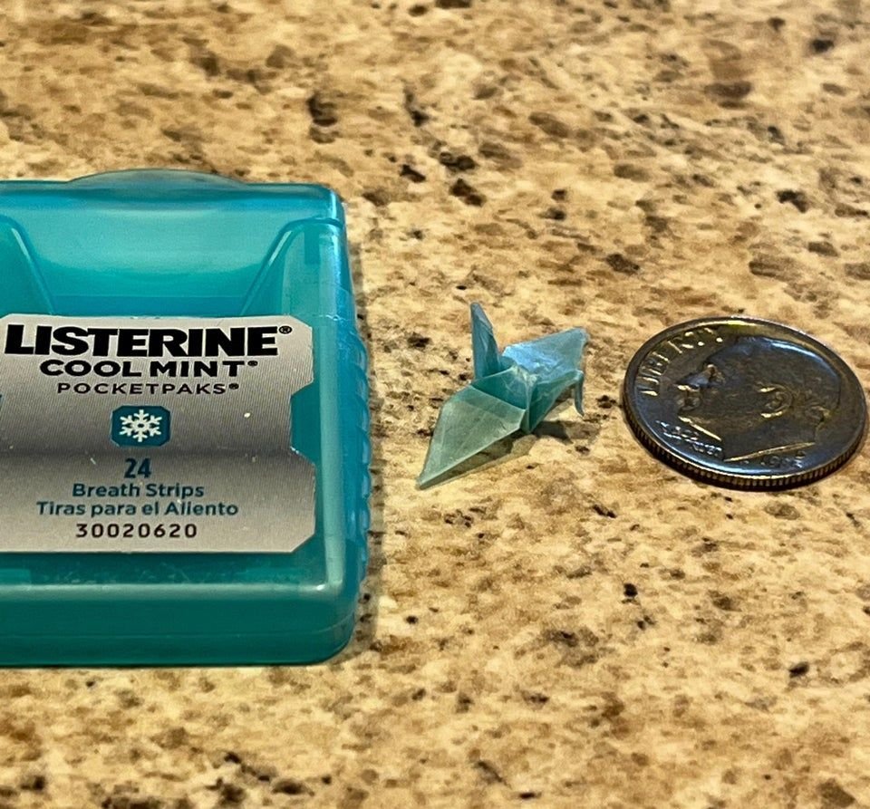 „Žeriav origami, ktorý som vyrobil so super mätou stip.“
