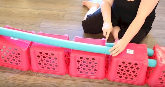 Košíky spojte zipsovými páskami a potom narežte bazénové rezance, aby ste vytvorili odstupy. Hometalk hovorí, že tieto dištančné podložky udržia policu podopretú, aby sa nevychyľovala.