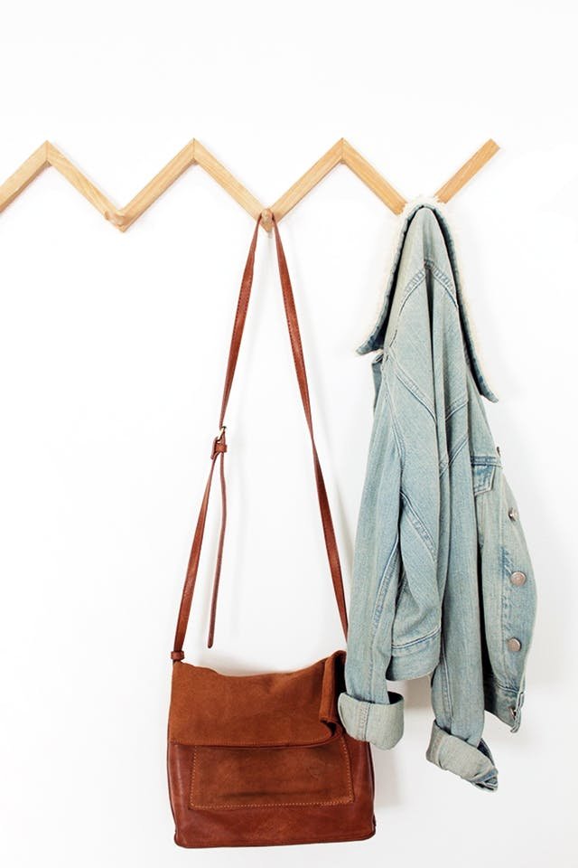 Z niekoľkých jednoduchých drevených kolíkov môžete vytvoriť zábavný cikcakový vešiak na kabáty.