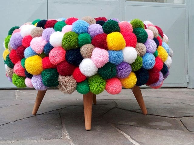 Vyrobte si stoličku na nohy s pom-pom, ktorá úplne rozžiari váš obytný priestor.