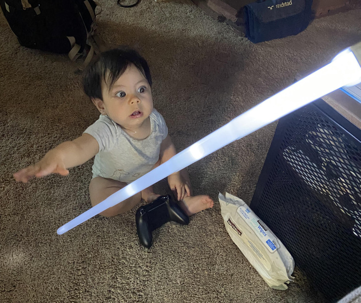 10. Môj syn vidí svetelný meč po prvýkrát. Jeho reakcia hovorí za všetko. Vyrastá nám tu ďalší fanúšik