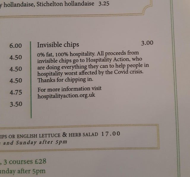 Pre tých, ktorí používajú aplikácie čítačiek, sa uvádza: “Neviditeľné čipy, 3,00 USD. 0% tuku, 100% pohostinnosť. Celý výťažok z neviditeľných čipsov ide na účet organizácie Hospitality Action, ktorá robí všetko pre to, aby pomohla ľuďom v pohostinstve najviac postihnutým krízou.”