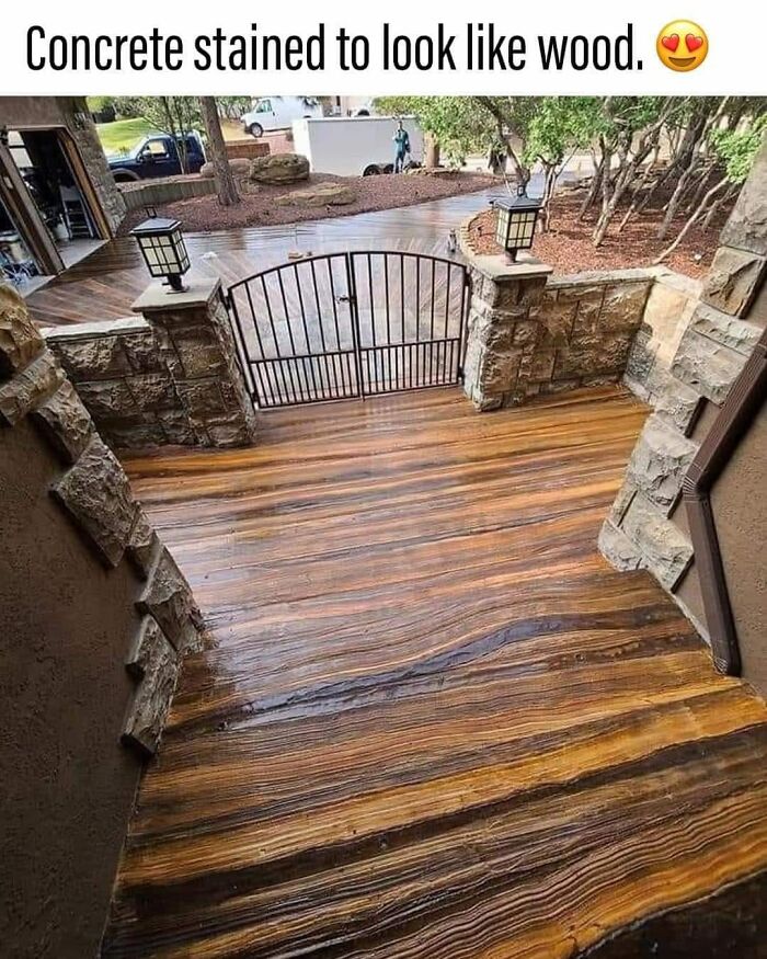 Betónové schody s hnedými a béžovými pruhmi, ktoré vyzerajú ako drevo. Pruhy sú rovnobežné so schodmi. Nie je možné určiť počet schodov