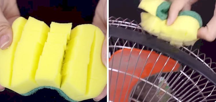 Ak ste to nikdy neskontrolovali, rotačné ventilátory sa dokážu úplne zašpiniť prachom. DIY YouTuberi WeDoIt ukazujú, že pokiaľ ide o utieranie prachu z ťažko dostupných zákutí, stačí vám na to vyčistená špongia. Tento postup funguje aj pri rúrach na pečenie a chladiacich stojanoch.