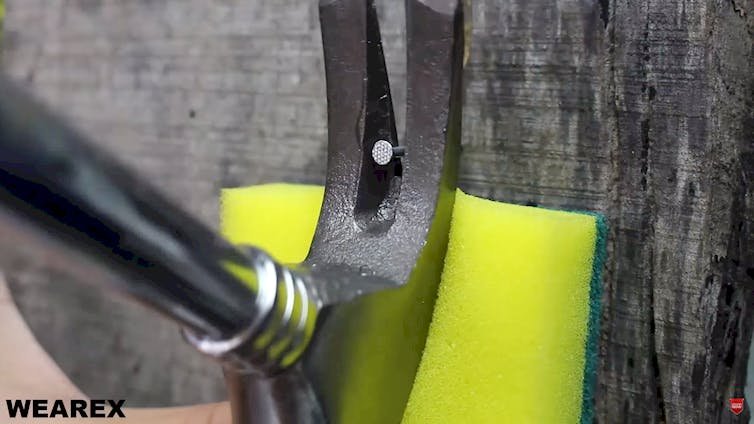 Na vyťahovanie klincov potrebujete iba pazúrik kladiva. Samotné kladivo však môže na stene zanechať nepríjemné škrabance a ryhy. Kanál Wearex na YouTube navrhuje použiť špongiu na zmiernenie úderu. Klinec sa odstráni a vaša stena je chránená!