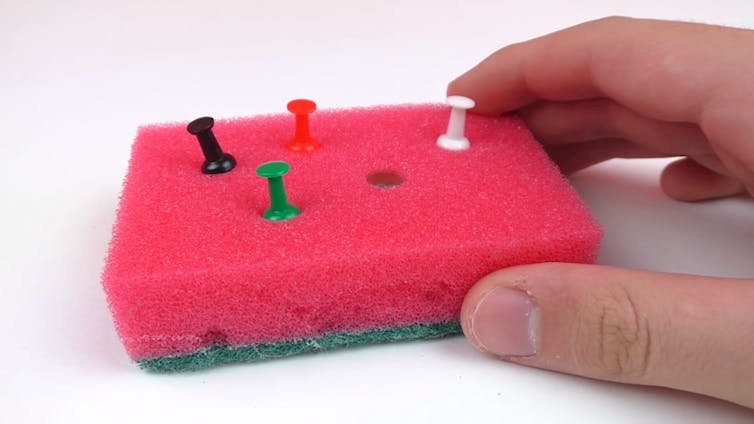 Tento postup je veľmi jednoduchý, ale ak pracujete s množstvom špendlíkov a špendlíkov, nevyhadzujte ich len tak do zásuvky – vložte ich radšej do špongie. Je to oveľa pohodlnejšie, ako sa pichať zakaždým, keď potrebujete nejaký špendlík. Za toto poďakovanie patrí YouTuberovi Power Vision.