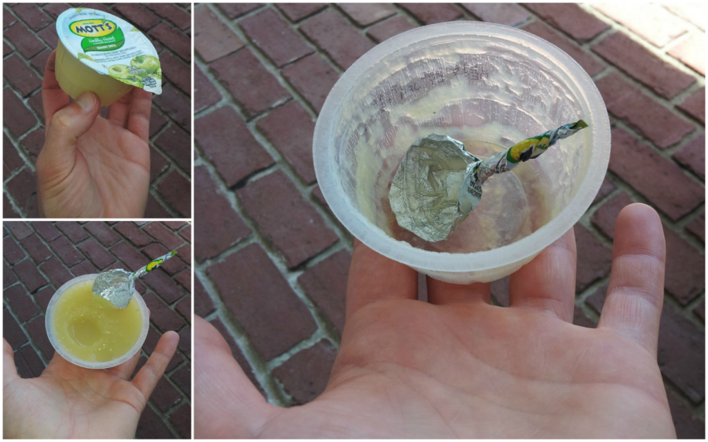 Fóliové viečko na niektorých potravinách je dostatočne pevné na to, aby sa dalo použiť ako príbor . Jednoducho vytočte rukoväť na jednom konci a vytvorte naberačku na druhom konci.