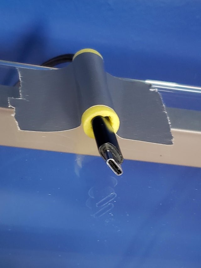 „Už ma nebavilo, že mi šnúra stále padá, tak som ju prevliekol cez šipku a prelepil páskou.“ Obzvlášť sa mi páči použitie šípky. Pridáva to trochu príchuti štandardnému hackingu s lepiacou páskou, viete?