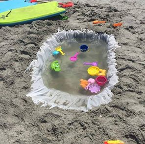 Vezmite si so sebou na pláž k slnku lacný sprchový záves. Potom vyhĺbte v piesku dieru, vysteľte ju sprchovým závesom a naplňte ju vodou, aby ste si rýchlo vytvorili detský bazén. Nezabudnite na hračky!