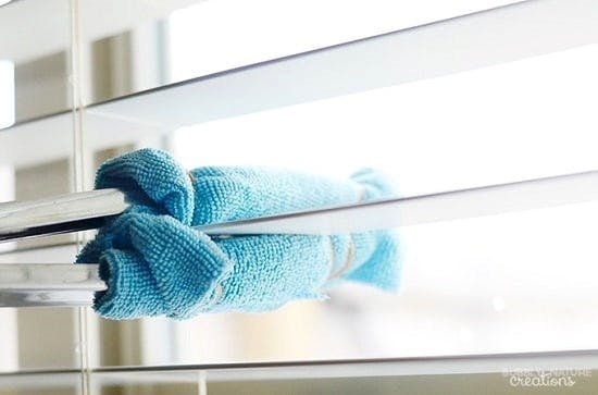 Pomocou gumičiek pripevnite utierku z mikrovlákna k páru klieští. Vezmite svoj obľúbený čistiaci prostriedok pre domácnosť a pomocou neho a klieští vyčistite špinavé, zanedbané horizontálne žalúzie v dome.