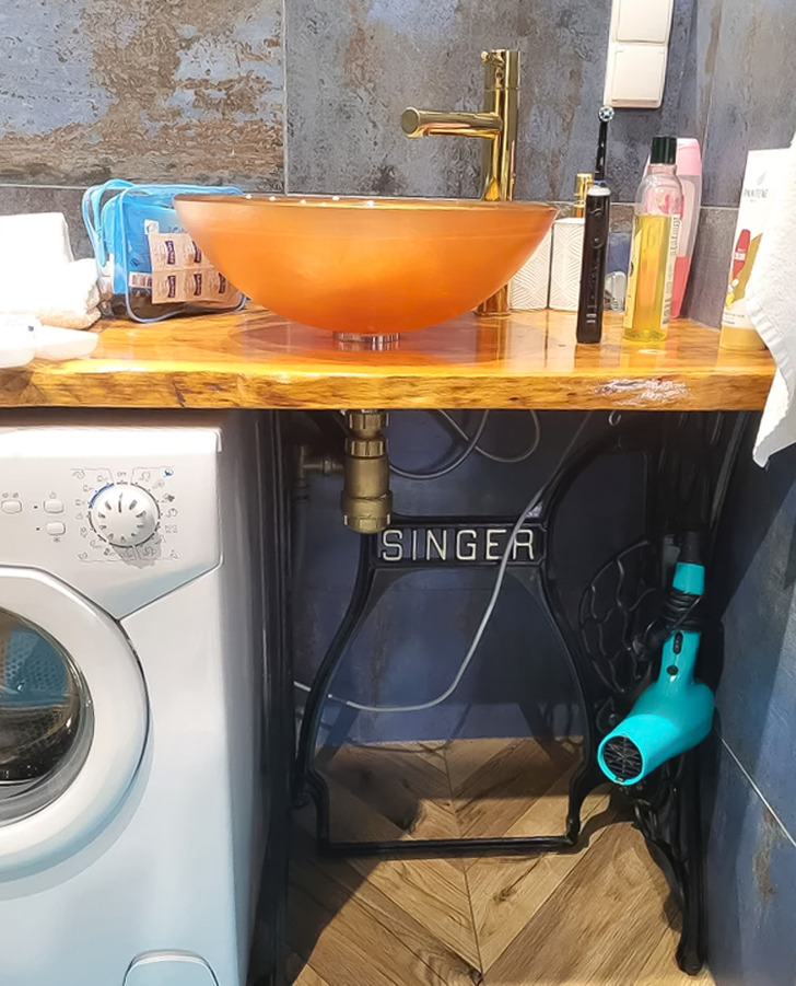 17. Umývadlo v mojom Airbnb ubytovaní je vyrobené z prerobeného šijacieho stroja