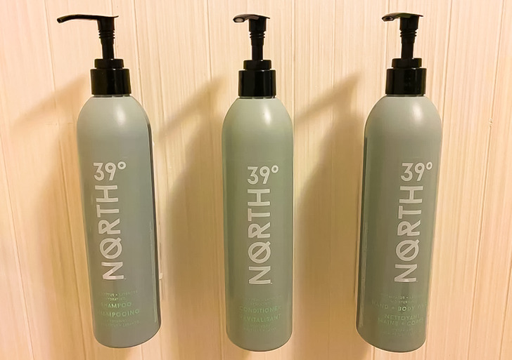 13. Takmer neviditeľný text na štítku na fľašiach hotelových sprchových dávkovačov. Ktorý je šampón? Bez okuliarov ti prajeme veľa šťastia