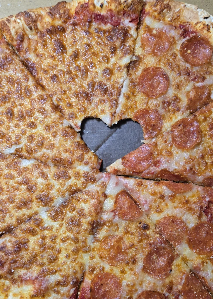 Môj manžel a ja sme si každý dali jeden kúsok, než sme si pizzu vzali domov, náhodné srdce!