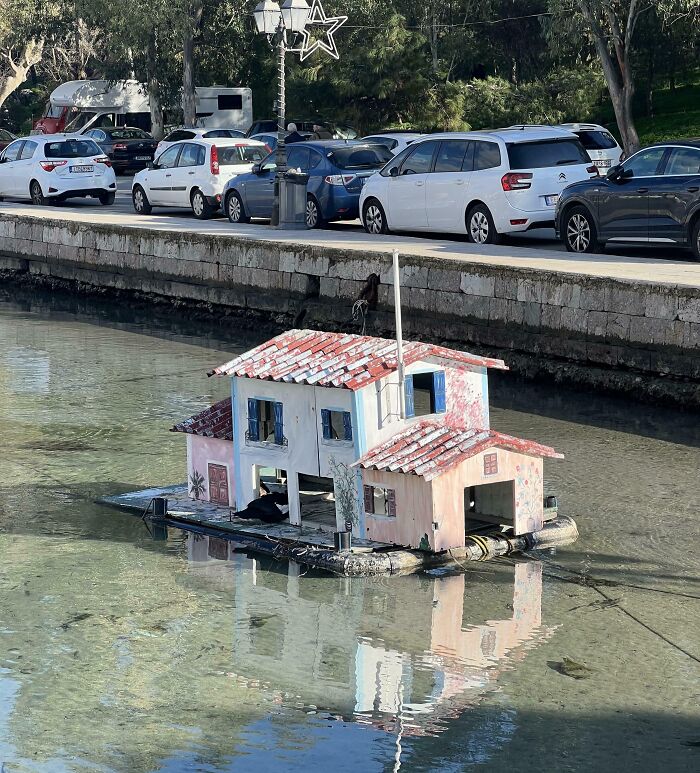 Malý domček pre kačice v malej prístavnej oblasti v Galaxidi v Grécku