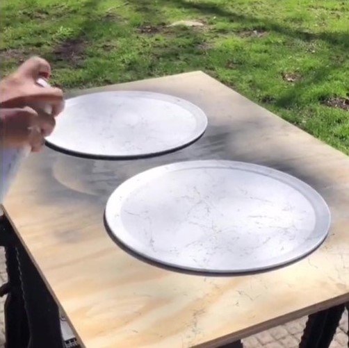 Maira chcela dosiahnuť efekt mramorovej stolovej dosky, preto začala striekať dva strieborné podnosy matným bielym náterom. Po zaschnutí základného náteru ich celé prelakovala farbou v spreji s mramorovým efektom, čím dosiahla žilkovanú štruktúru, akú vidíme na skutočných mramorových doskách. Nakoniec oba podnosy pokryla bezfarebnou lesklou farbou v spreji a počkala, kým všetko zaschne.