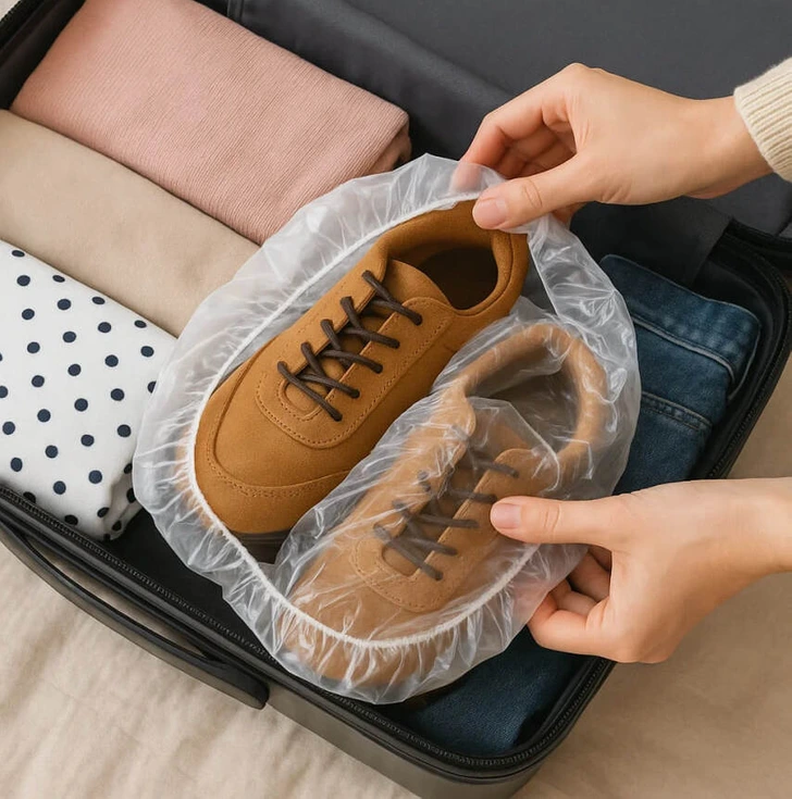 Topánky zaberajú veľa miesta, takže tento priestor využite rozumne. Zrolovaním ponožiek a vložením ich do topánok ušetríte miesto a zabránite deformácii obuvi. Takisto budete mať ponožky usporiadané a ľahko ich nájdete. Na spiatočnej ceste, ak sú topánky špinavé, môžete na ne nasadiť voľnú – a často nepoužívanú – hotelovú sprchovú čiapku, aby zostali čisté.