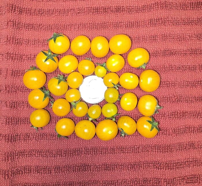 V mojom hydroponickom systéme som vypestoval paradajky „Micro Gold“. Vzhľadom na to, že obe moje rastliny boli menšie ako 10 cm, je to veľmi dobrá úroda (To je americká štvrťdolarová minca uprostred)