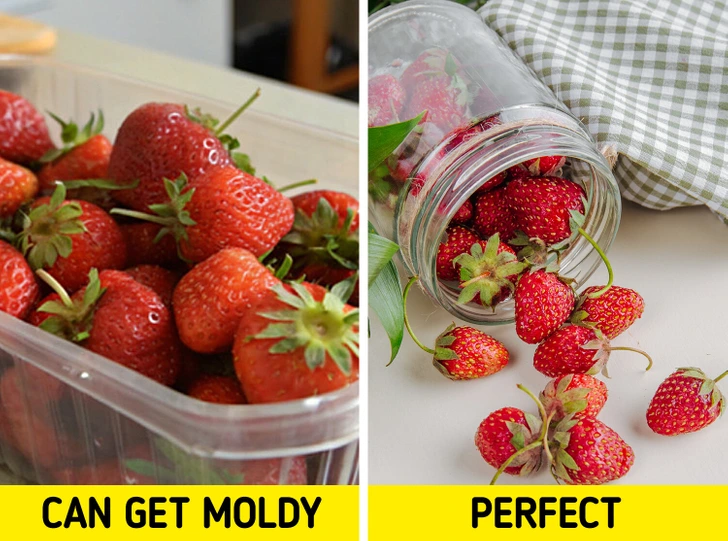 Ovocie, ako sú bobule, avokáda a citrusové plody, by sa nemalo nechávať v plastových nádobách. V dôsledku nedostatočného vetrania a hromadenia vlhkosti môžu plesnivieť a rozpadávať sa.